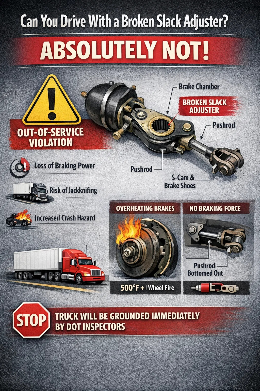 সংক্ষিপ্ত উত্তর হল একেবারে না আপনি আইনত বা নিরাপদে একটি ভাঙা, ত্রুটিপূর্ণ, বা ভুলভাবে সামঞ্জস্য করা স্ল্যাক অ্যাডজাস্টার সহ একটি বাণিজ্যিক যানবাহন চালাতে পারবেন না। পরিবহণ অধিদপ্তর (ডট) এবং নিরাপত্তা পরিদর্শকদের চোখে একটি ভাঙা স্ল্যাক অ্যাডজাস্টার একটি "পরিষেবার বাইরে" লঙ্ঘন। আপনি যদি এই ত্রুটি সহ একটি যানবাহন চালাতে ধরা পড়েন তবে আপনার ট্রাকটি পরিদর্শন সাইটে অবিলম্বে গ্রাউন্ড করা হবে।