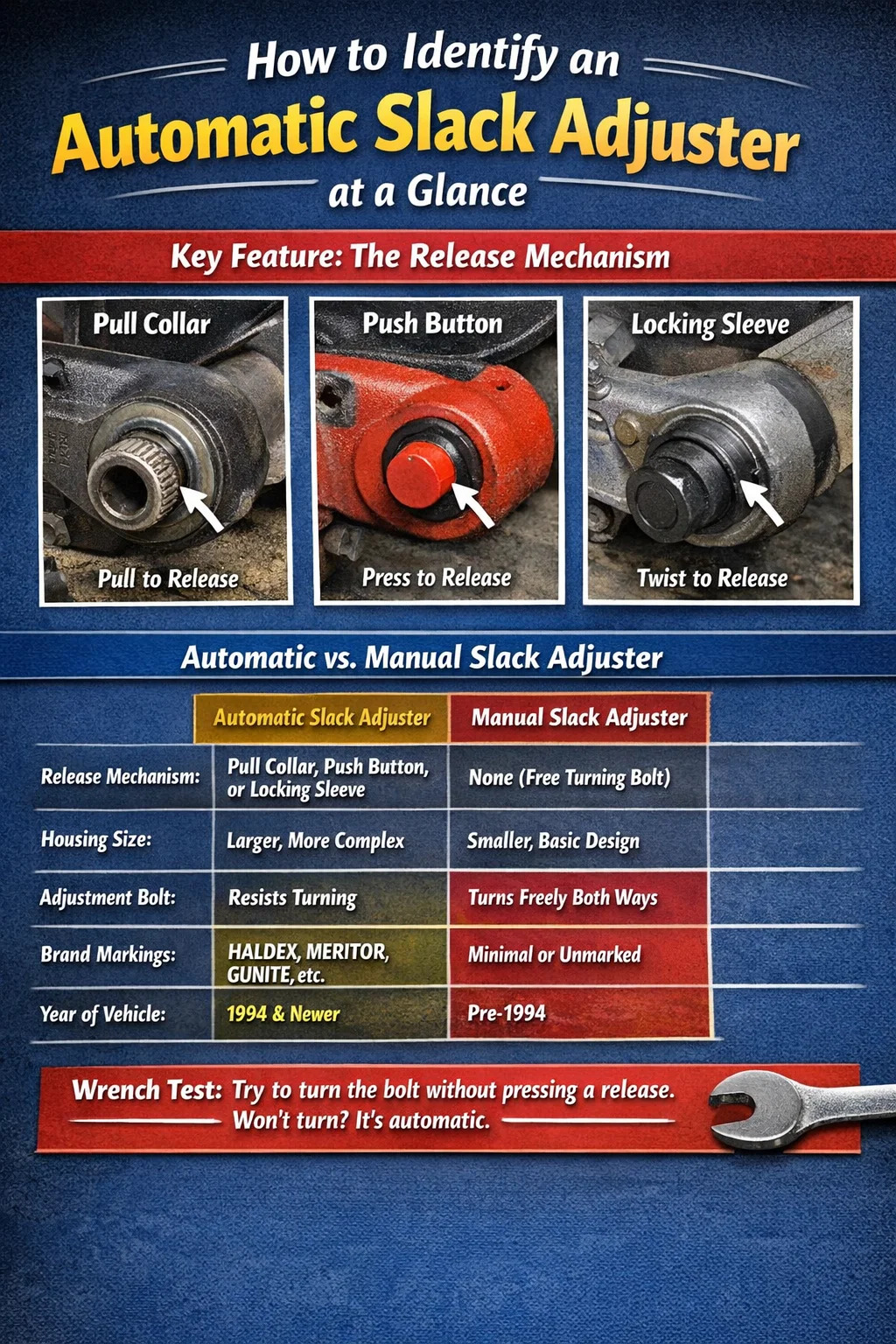 একটি স্বয়ংক্রিয় স্ল্যাক অ্যাডজাস্টার দ্বারা চিহ্নিত করা যেতে পারে অ্যাডজাস্টার বডিতে রিলিজ মেকানিজমের উপস্থিতি — হয় একটা পুল-টাইপ কলার, একটা পুশ-বোতাম, অথবা একটা লকিং হাতা — ওয়ার্ম গিয়ার অ্যাডজাস্টমেন্ট বল্টের কাছে অবস্থিত। এই রিলিজ বৈশিষ্ট্যটি সবচেয়ে নির্ভরযোগ্য ভিজ্যুয়াল সূচক যা একটি স্বয়ংক্রিয় স্ল্যাক অ্যাডজাস্টার (কSক) কে একটি ম্যানুয়াল থেকে আলাদা করে। একটি ম্যানুয়াল অ্যাডজাস্টারে, হেক্স বোল্ট কোন লকিং মেকানিজম ছাড়াই উভয় দিকে অবাধে মোড় নেয়। একটি স্বয়ংক্রিয় সমন্বয়কারীতে, সেই একই বোল্টটি একটি ক্লাচ বা পল সিস্টেম দ্বারা সুরক্ষিত থাকে যা স্বাভাবিক ব্রেক অপারেশনের সময় দুর্ঘটনাজনিত ব্যাক-অফ প্রতিরোধ করে।
