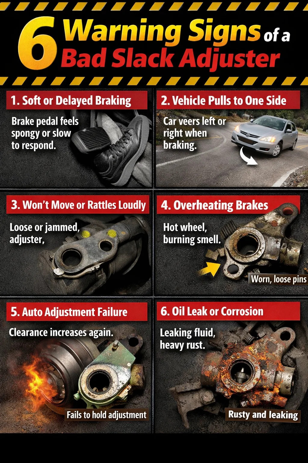 একটি স্ল্যাক অ্যাডজাস্টার "ব্যর্থ" হয়েছে কিনা তা নির্ধারণ করার জন্য আপনাকে শীর্ষস্থানীয় মেকানিক হতে হবে না; আপনি প্রায়শই দৈনন্দিন ড্রাইভিং সংবেদন এবং সাধারণ চাক্ষুষ পরিদর্শনের মাধ্যমে লক্ষণগুলি সনাক্ত করতে পারেন।