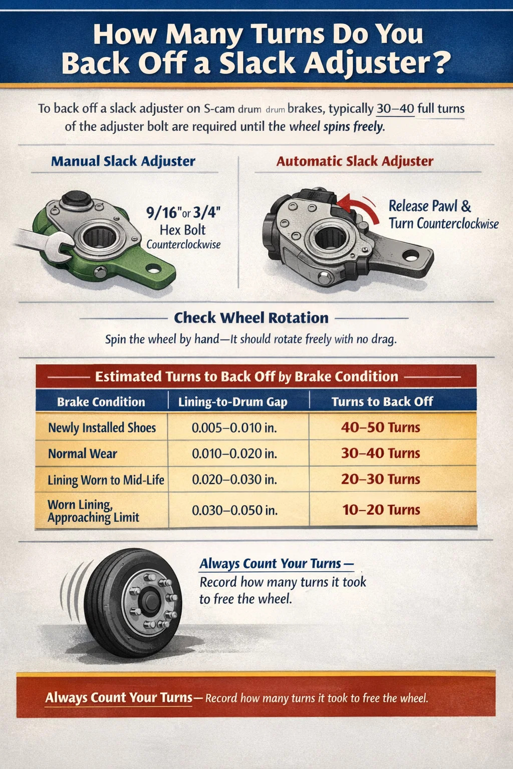 একটি স্ল্যাক অ্যাডজাস্টারকে ব্যাক করার জন্য আদর্শ পদ্ধতি ম্যানুয়াল অ্যাডজাস্টার বল্টের প্রায় 30 থেকে 40 পূর্ণ বাঁক — অথবা যতক্ষণ না ব্রেক জুতা ড্রাম থেকে সম্পূর্ণরূপে প্রত্যাহার না হয় এবং চাকাটি টেনে না নিয়েই অবাধে ঘোরে। স্বয়ংক্রিয় স্ল্যাক অ্যাডজাস্টার (কSAs) এর জন্য, রিলিজ প্রক্রিয়াটি কিছুটা আলাদা: আপনি প্যাল মেকানিজমটি বন্ধ করে দেন এবং পুশরড ট্র্যাভেল স্পেকের মধ্যে না হওয়া পর্যন্ত বা ব্রেকগুলি ড্রাম থেকে পরিষ্কার না হওয়া পর্যন্ত ম্যানুয়ালি অ্যাডজাস্টার বন্ধ করে দেন। বাঁকগুলির সঠিক সংখ্যা মেক, মডেল এবং বর্তমান ব্রেক সামঞ্জস্য অবস্থার উপর নির্ভর করে পরিবর্তিত হয়, তবে 30-40 টার্ন হল বেশিরভাগ এস-ক্যাম ড্রাম ব্রেক সিস্টেমের জন্য একটি নির্ভরযোগ্য বেসলাইন।