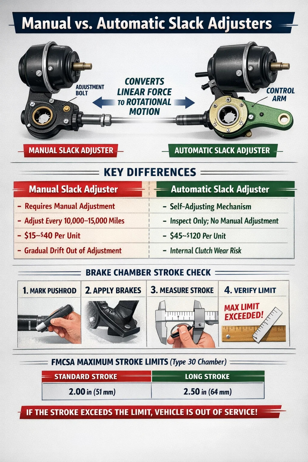 এফএমসিএসএ প্রবিধানের অধীনে উত্তর আমেরিকায় আইনত প্রয়োজনীয় সর্বাধিক ব্রেক চেম্বার স্ট্রোক চেম্বারের আকার দ্বারা সংজ্ঞায়িত করা হয় - একটি টাইপ 30 চেম্বারের জন্য, সেই সীমা হল 2 ইঞ্চি (51 মিমি)। এটি অতিক্রম এবং যানবাহন পরিষেবার বাইরে স্থাপন করা হয়. একটি স্ল্যাক অ্যাডজাস্টার যা সামঞ্জস্যের বাইরে, জব্দ করা বা পরিধান করা বাণিজ্যিক ট্রাক লেভেল I রাস্তার ধারের পরিদর্শনে ব্যর্থ হওয়ার সবচেয়ে সাধারণ কারণগুলির মধ্যে একটি।
