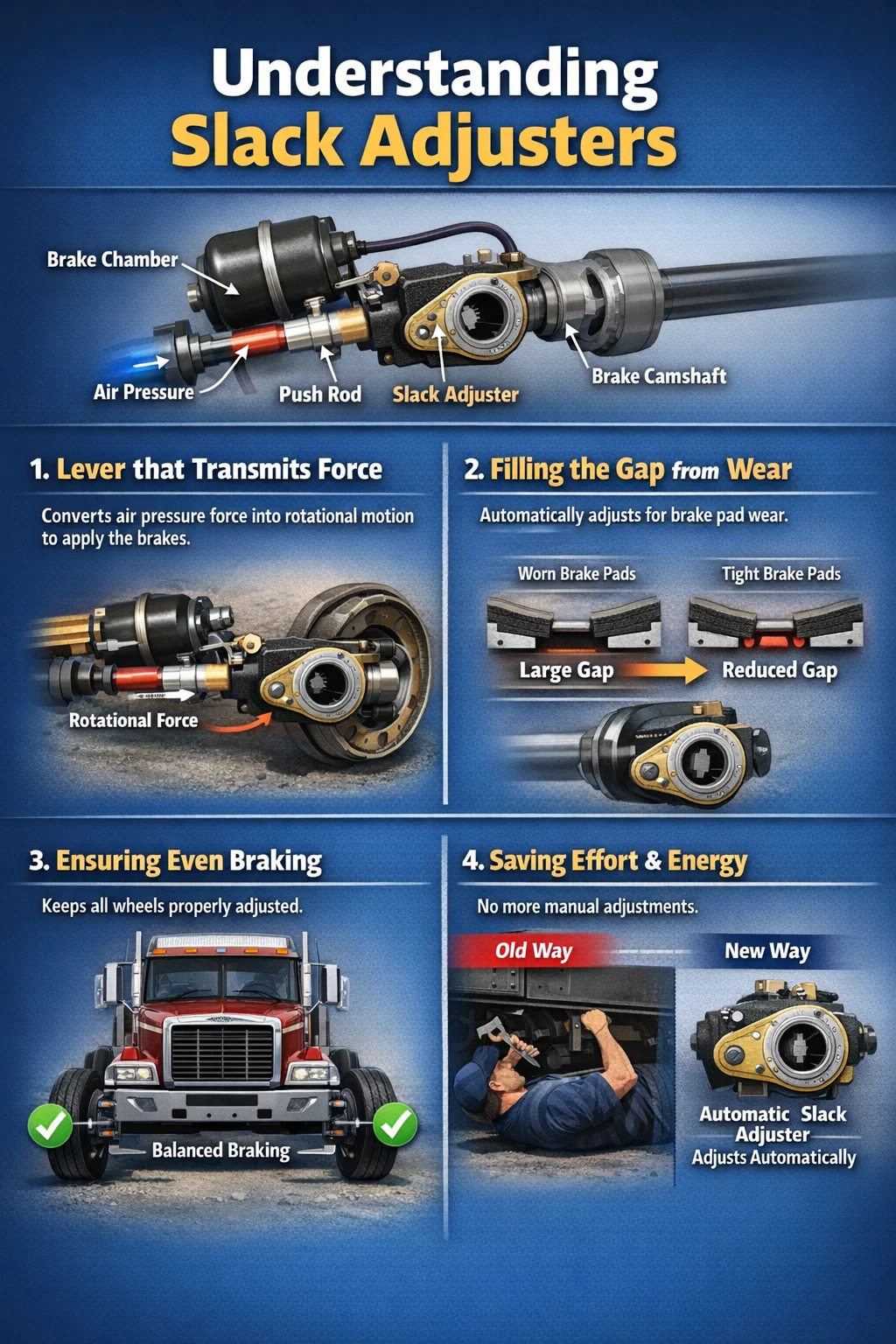 স্ল্যাক অ্যাডজাস্টার বড় ট্রাক এবং বাসের ব্রেকিং সিস্টেমে একটি "অনুবাদক" এবং "স্বয়ংক্রিয় ব্যবস্থাপক" এর মতো। এগুলি ব্রেক চেম্বার এবং ব্রেক শ্যাফ্টের মধ্যে অবস্থিত।